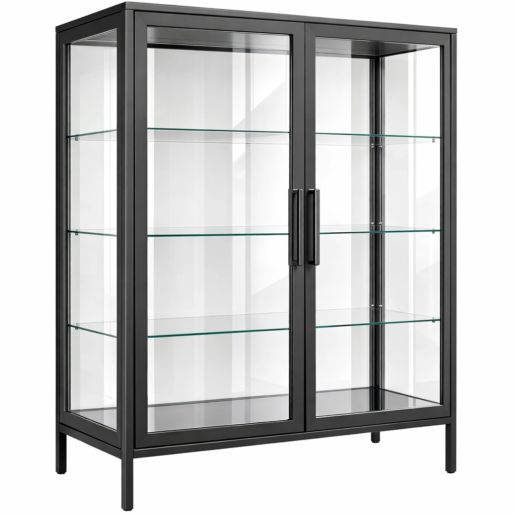 Vitrine aus gehärtetem Glas und Stahl Schwarz mit 3 Böden