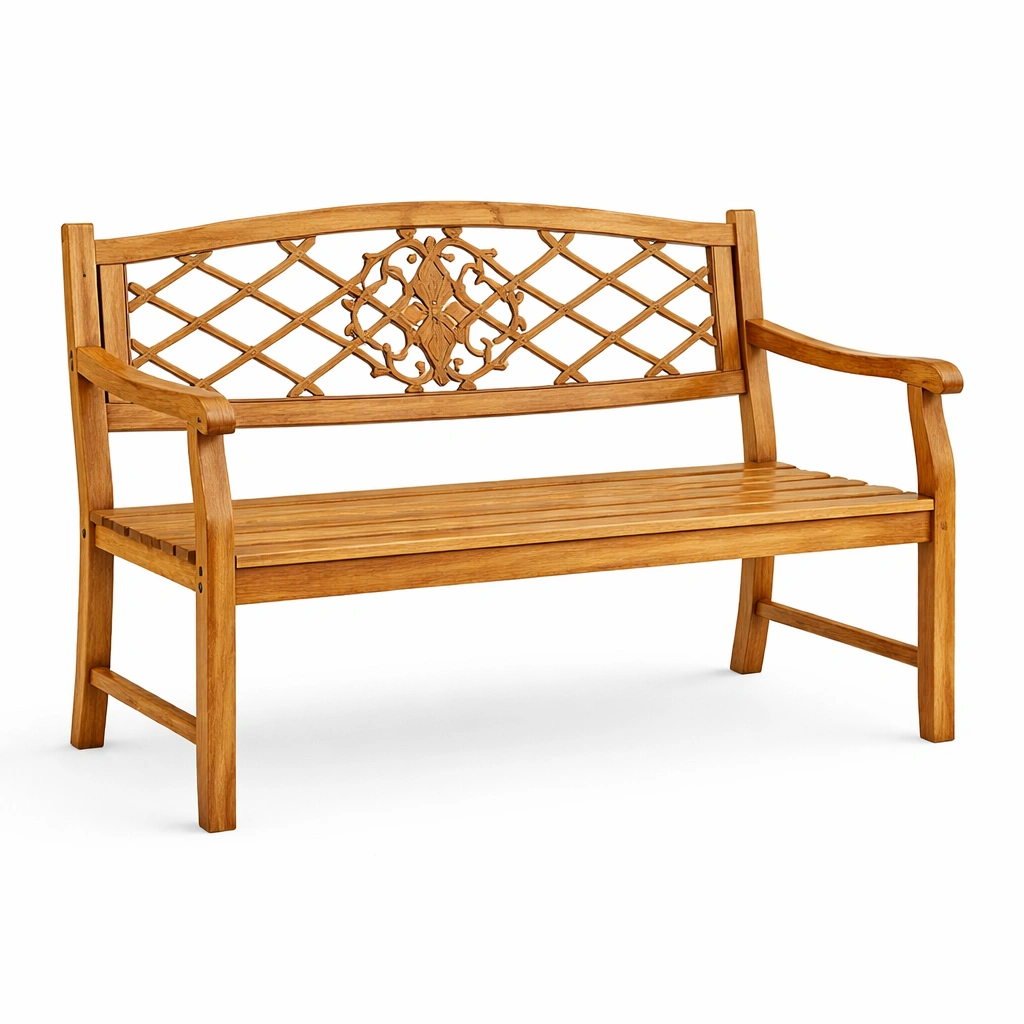 Diese Gartenbank besteht aus massivem Eukalyptusholz und ist für den Außenbereich geeignet.