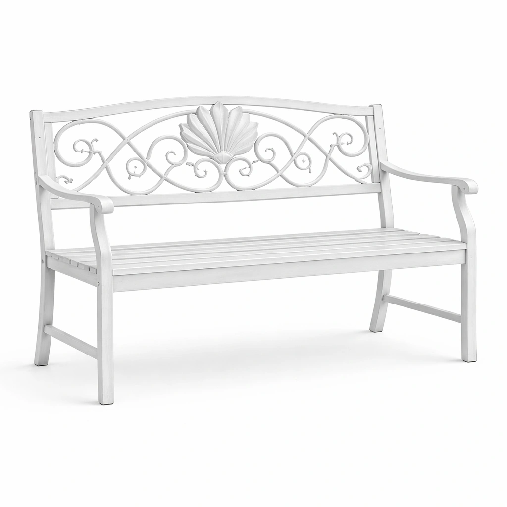 Diese Gartenbank besteht aus pulverbeschichtetem Eisen, das witterungsbeständig ist. Die Abmessungen sind Länge: 126 cm, Breite: 60 cm, Höhe: 85 cm.