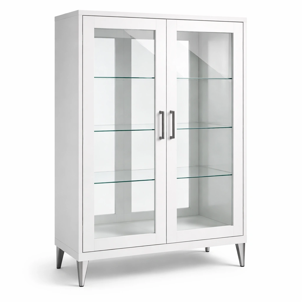 Dieser Vitrinenschrank besteht aus MDF mit gehärtetem Glas von 5 mm Dicke. Er hat vier Ebenen und ist mit Glastüren ausgestattet. Die Beine und Griffe sind aus Metall gefertigt. Die Abmessungen betragen: Höhe 180 cm, Breite 120 cm, Tiefe 40 cm.